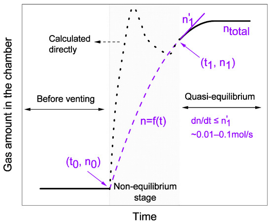 Before the process of the venting event, the interior of the chamber was regarded as in an equilibrium state; hence, the initial gas amount n0 from the ideal gas law was approximately precise and convincing. Similarly, at the end of the venting event, the releasing rate of gases produced inside the battery gradually decreased; therefore, it was reasonable and tolerable to introduce the ideal gas law, assuming that the internal gases were in a quasi-equilibrium state. However, there was a non-equilibrium stage due to extremely uneven temperature fields caused by the violent ejections, where the ideal gas law was not applicable, as shown in Figure 3. This stage was unpredictable because of the complex variations in the ejections. Though an assumption of uniform ejection can complete the unpredictable stage for simplification, the maximum rate of gas release would obviously be lower than the correct value, leading to an underestimation of the intensity of the venting event. The uniform ejection assumption cannot interpret the fact that the venting process gradually weakens, resulting in a discontinuity point at the end. In general, (t0, n0) can be decided by the ideal gas law [25] in the quasi-equilibrium stage, and (t1, n1) and ntotal are easily obtained from Equation (1), where n3′ is the slope of linear fit locally at t1, almost varying within 0.01–0.1 mol/s. Usually, the rising rate of gas amounts after the point has a trend of approximately monotonic decrease.