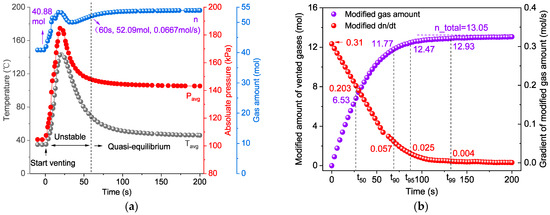 A typical case of 100% SOC 153 Ah NCM523 battery for the application of ‘two-point’ fitting method. (a) The thermodynamic behavior in the sealed chamber. The gray, red, and blue points are the average temperature, pressure, and gas amount without modification during thermal runaway in the chamber. (b) The modified results. Venting durations are obtained from the figure.