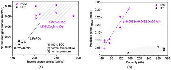 Normalized gas amounts as well as maximum gas releasing rates represent the ability to generate gases from thermal runaway reactions, directly resulting in overpressure and a strong impact on the structure in various degrees. Figure 5 illustrates the gaseous venting behaviors of fully charged LFP and NCM batteries at normal temperatures and pressures regarding total gas amount and maximum gas releasing rate with respect to specific energy density and capacity. As evident from Figure 5a, the range of normalized gas amounts, defined as gas production per unit capacity, is significantly different with cathodes, while there is a weak positive correlation between normalized gas amount and specific energy density, considering LFP or NCM separately. In regard to NCM batteries, the normalized gas amount varies within 0.075–0.105 mol/Ah (1.68–2.35 L/Ah), consistent with 0.09 mol/Ah [18] and 0.08 mol/Ah [17] to a certain degree, while that for LFP batteries is only 0.025–0.035 mol/L (0.56–0.78 L/Ah), close to 0.03 mol/Ah, found in previous work [17], implying that NCM batteries generate more than around 1–3 times the gases in moles compared to LFP batteries. It is noteworthy that for batteries with LFP cathodes or low SOCs, more substances such as the liquid electrolyte uninvolved in exothermic reactions may emerge in a gaseous state at elevated temperatures. As for the maximum gas releasing rate derived from the ‘two-point’ fitting method in Figure 5b, the predicted values demonstrate a strongly positive correlation with battery capacity instead of specific energy density for either NCM or LFP batteries. This could be explained well by the sufficient reactants for larger capacities in terms of NCM or LFP cathodes. A linear fit to predict the maximum gas releasing rate is provided for NCM batteries as a function of capacity in Figure 4b. The results provide quantitative indexes to guide safety design related to venting processes.