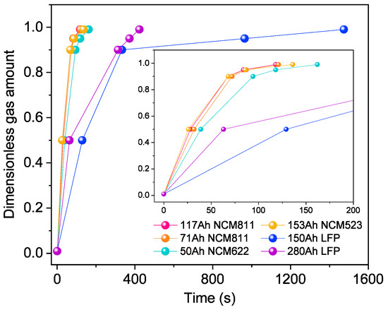 Venting duration is another parameter to describe the evolution of venting events. Combined with t50, t90, t95, and t99, the evolution of a venting process is roughly sketched, as shown in Figure 6 where the y-axis ranges within 0–1, corresponding to the subscripts of the above variables. Without a doubt, the venting process of NCM batteries is terminated much earlier than that of LFP batteries. Generally, the venting event disappears in only 2 or 3 min for NCM batteries, while several or tens of minutes are necessary for all gases to be ejected out of LFP batteries, suggesting a longer period to deal with the exhaust. Interestingly, venting durations seem close to each other for NCM batteries, allowing similar strategies to be applied to the battery system.