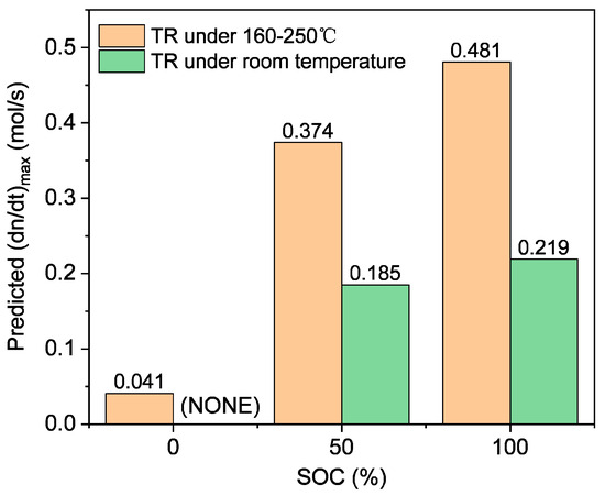 Ambient temperature not only accelerates the evaporation of electrolytes ejected out of the tested battery but also increases the proportion of gaseous components with a large molecular weight [16]. Figure 7 shows a comparison of predicted maximum gas releasing rates under different temperatures for 117 Ah prismatic NCM811 batteries, and only the cases of 50% SOC and 100% SOC make sense. A venting event occurring at elevated temperatures tends to erupt more violently and increase by double, compared to either 0.374 mol/s under 160–250 degrees Celsius with 0.185 mol/s at room temperature for 50% SOC or 0.481 mol/s under 160–250 degrees Celsius with 0.219 mol/s at room temperature for 100% SOC.