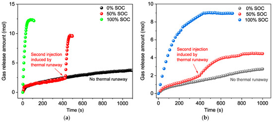The variation in gas amount during the venting process. (a) Different SOCs for 117 Ah NCM811 prismatic batteries tested at normal pressure and over 160 degrees Celsius. (b) Different SOCs for 280 Ah LFP prismatic batteries tested at normal pressure and temperature.