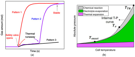 The venting event was strongly correlated with the evolution of pressure inside the battery as well as the burst pressure of the safety valve. Figure 4b proposes schematically the contributions of chemical reactions, thermal expansion of the original gases, and evaporation of electrolytes into the internal pressure without venting and shell deformation [12,15,22,25,33]. Once a battery is chosen, the burst pressure of the safety valve should vary within a small range, leading to a similar temperature on average corresponding to the venting event. When the battery temperature reaches around that value, whether thermal runaway is triggered or not determines different venting patterns. The three venting patterns are summarized as follows: