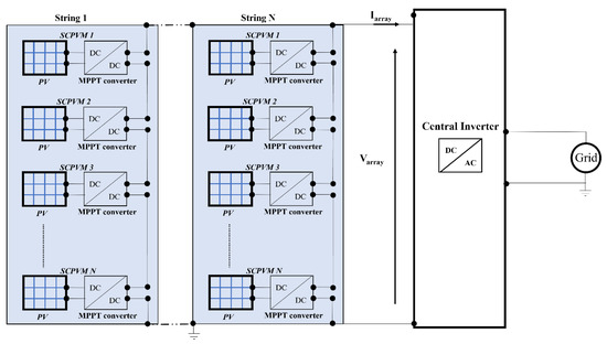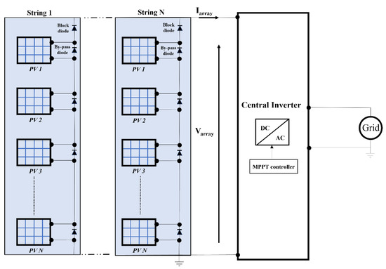 According to forecasts of the International Energy Agency (IEA), the world renewable capacity will increase by almost 2400 GW between 2022 and 2027; solar PV will represent over 60% of all renewable capacity expansion [1]. PV energy sources are the most attractive renewable sources, due to their availability and sustainability. Thanks to simpleness and modularity of installation, PV power plants of different sizes are now widespread all over the world. In a typical PV plant, modules are connected in series and create a string to provide the required output voltage; then, strings can be connected in parallel to form an array that can produce the required current. It is well known that, in the case of uniform temperature and irradiance conditions, the output current vs. voltage (I–V) characteristic of a PV array is non-linear and exhibits a unique Maximum Power Point (MPP) corresponding to the maximum power (PMPP) that the array is able to provide [2,3]. To ensure the maximum utilization of the array, it is essential to work in the MPP. Unfortunately, a direct connection of the output PV generator to the load (i.e., battery, AC grid, etc.) is not an optimal solution because in this case the operating point does not match with the MPP. In addition, the position of the MPP changes during the day due to many effects, such as changes in temperature and variation in solar radiation. For this reason, a Centralized Architecture (CA) of the PV array is adopted, where a central inverter, as shown in Figure 1, is generally interposed between the output terminals of the generator and the load; it must be able to change its parameters (i.e., its duty cycle) to adapt the load to the source to operate at MPP [4]. In such conditions, the energy performance is optimized [3] and the PV system behaves like a synchronized complex network, in which the extracted power is the maximum allowable and is the sum of the maximum power of each individual PV module [5,6]. A great variety of methods are able to track the MPP in PV plants; these so-called Maximum Power Point Tracking Techniques (MPPT) have been proposed in the literature and are categorized and commented on in many books and review papers [4,7,8,9,10,11].