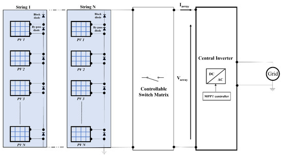The classification includes the so-called “Hill Climbing”, “Curve Fitting”, “Dynamical” and “Machine Learning” MPPT techniques [10,12,13,14]. The above techniques are high-performing in the absence of mismatching operating conditions. Unfortunately, mismatching working conditions of the PV plant are very frequent. In such a case, the PV modules of an array operate in nonuniform conditions, due to shadowing of neighboring objects, dirtiness of modules, clouds, installation on irregular surfaces and different orientation angles of modules in the PV field, but also manufacturing tolerances or uneven aging, etc. In the case of mismatch, the PV modules are not synchronized and the maximum extractable power is lower than the sum of the maximum power over each individual PV module [15,16,17,18]. Moreover, the power vs. voltage (P–V) characteristic of the PV system may exhibit multiple peaks, one global maximum point (GMP) and many local peaks, due to the presence of bypass diodes used to protect PV modules from hot spots and thermal breakdown. Therefore, the efficiency of MPPT methods decreases dramatically [15,16,19]. For instance, the Perturb and Observe (P&O) technique, which is the most used method, may track local maxima, but not global maximum points [20] because they cannot differentiate the global maximum point with respect to local maxima. In conclusion, the impact and power loss due to mismatch depend on the PV modules’ operating points and on their electrical configuration. To maximize the efficiency of the module and track the global maximum point in case of mismatching conditions, a possible solution is offered by the dynamical reconfiguration of PV modules [21]. A basic scheme of a reconfigurable grid-connected PV system is shown in Figure 2. Like in complex networks, the topology of the network is dynamically changed using active switches to reach the synchronization of the modules and power maximization [22,23,24,25]. These techniques have proved to be efficient in mismatching conditions, although they are relatively expensive since they require the use of reliable devices able to switch high Direct Currents (DCs) [21,26,27]. An alternative solution to mitigate mismatching’s effects is the adoption of a Distributed Architecture (DA) in which, unlike the centralized one, each PV module, as shown in Figure 3, is equipped by an independent DC/DC converter and a dedicated Distributed Maximum Power Point Tracking (DMPPT) controller [28,29,30].