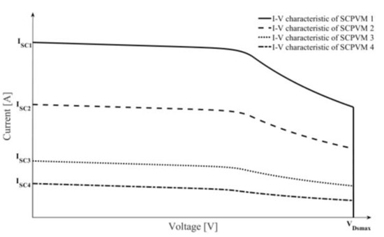 where VMPP_C represents the VMPP in Standard Operating Conditions (STC). The easy availability of VMPP_C on the manufacturers’ datasheets is the main advantage of this approach. The second hypothesis is based on the substitution of that part of the I–V characteristic for VSCPVM ≤ VMPP, which cannot be expressed in an easy explicit form I = f(V) [35], with a simpler constant characteristic: