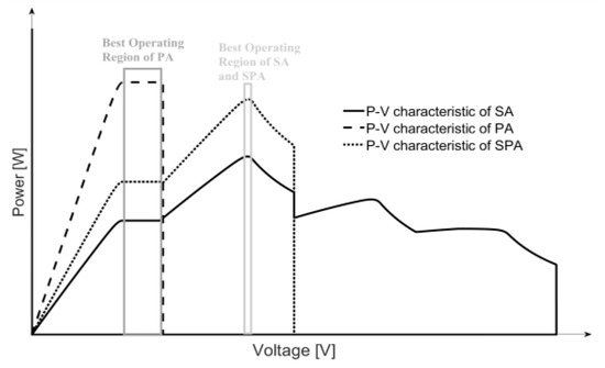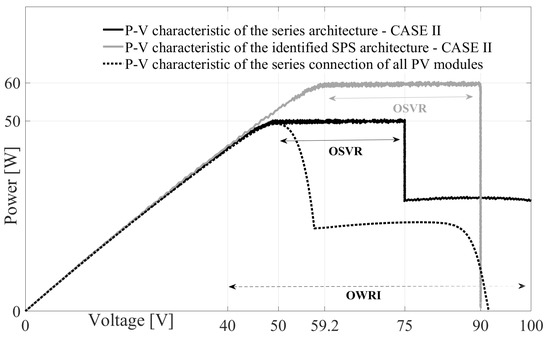 P–V characteristics of the series and the identified SPS architectures (Case II).