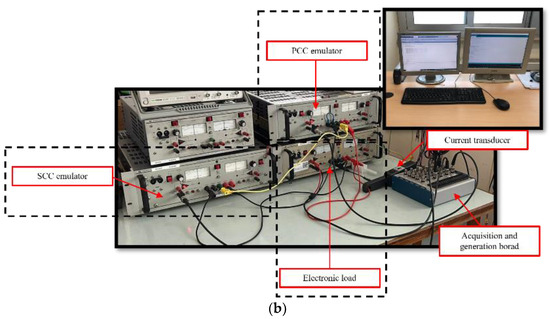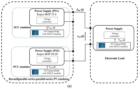 The proposed algorithm has been verified experimentally by the laboratory setup whose schematic and physical implementation are shown in Figure 7. The test bed consists of two fundamental blocks, i.e., the Emulation Block (EB) and the Acquisition and Generation Block (AGB). The emulation block is carried out by three commercial controlled power supplies (Kepco BOP). The first two (PS1 and PS2) being, respectively, the power stage of the Series Configuration Cluster (SCC) emulator and the Parallel Configuration Cluster (PCC) emulator. The third one is used as an “Electronic Load” to scan the I–V characteristics of the proposed Reconfigurable Series-Parallel-Series Emulator (RSPSE), featured by the series connection of the above two emulators (SCC emulator and PCC emulator). The three power supplies can work in all four quadrants of the current–voltage plane. They are linear power supplies with two bipolar control channels (voltage or current mode), selectable and individually controllable by either front panel controls or remote signals. The electrical characteristics of the overall system are reported in Table 2. It is evident that the proposed experimental setup is suitable for the emulation of reconfigurable domestic PV systems, characterized by severe mismatching scenarios.