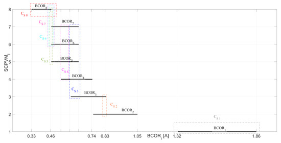 Case I refers to the following ordered short circuit current vector, which can be obtained by applying Step 1 of the proposed algorithm: ISC_V = [2.04 1.13 0.92 0.82 0.7 0.7 0.7 0.7 0.5]A. The corresponding values of BCORs are listed in Table 5.