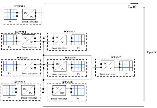 In the following, for the sake of simplicity, but without any loss of generality, a Boost-based DMPPT PV field made of N = 8 self-controlled PV modules will be considered. In Italy, most domestic PV plants are characterized by such architecture, with a power capability less than or equal to 3 kW. In addition, the monocrystalline solar panel capability of between 360 and 380 W represents, currently, an Italian market standard. As shown in Figure 6, the output of a proposed reconfiguration process, carried out with a proper controlled switch matrix, can be a Series-Parallel-Series (SPS) architecture in which several parallel clusters of SCPVMs are connected in series.