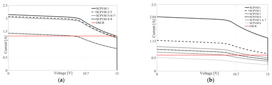 The increased extractable power is not the only advantage of using the proposed approach. Referring to the identified SPS architecture (Figure 11a), the saturation and reverse bias working conditions are completely avoided, since in the Optimal String Current Range (OSCR), that in this case collapses at one point, all SCPVMs can provide the maximum available power. The same considerations do not hold for the standard series architecture, since the OSCR (red curve of Figure 11b) does not intersect the branches of the hyperbole of all SCPVMs. The SCPVM1, SCPVM2 and SCPVM8 are excluded. In particular, the first two work in the saturation state, while SCPVM8 works in a reverse bias condition since the OSCR is higher than its short circuit current. In conclusion, in the identified SPS architecture, the negative effects of mismatching conditions are completely mitigated.