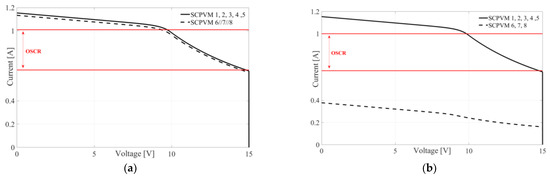 Case II refers to the following short circuit current vector: ISC_V = [1.13 1.13 1.13 1.13 1.13 0.37 0.37 0.37]A. Repeating the same steps previously illustrated led to the SPS architecture shown in Figure 12, and whose energetic performances are reported in Figure 13 and Figure 14. Even in this second considered case, the operating performance of the identified SPS architecture is higher than that obtained with the classical approaches, both in terms of efficiency (20% increase in extracted power) and reliability (no SCPVM works in the reverse and/or in the saturation state). On this last point, it is evident that, in the OSCR of the classical architecture (Figure 14b) the SCPVM6, SCPVM7 and SCPVM8 work in reverse bias conditions with consequent reduction of the reliability of the whole system. Even in this considered case, the proposed reconfiguration algorithm is able to face the efficiency and reliability reduction when mismatching conditions occur.