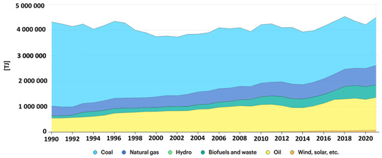 Energy supply in Poland 1990–2020 (https://www.iea.org/countries/poland, accessed on 20 September 2023): Yellow—oil; green—biofuels and waste; dark blue—natural gas; blue—coal. (Source: IEA World Energy Balances 2022. All rights reserved).