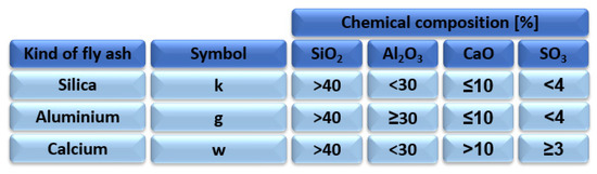 Due to the large production of fly ash in the energy sector, the idea of reusing fly ash in industry is constantly being improved. Since the fact that the development of fly ash as a raw material is restricted by the restrictions and regulations issued by the state authorities, fly ash is dumped in large amounts in heaps or landfills. Improper management of fly ash can lead to contamination of the atmosphere, earth, water, and air [30]. With regard to the restrictions in place, Poland has divided ash into three types Figure 3.