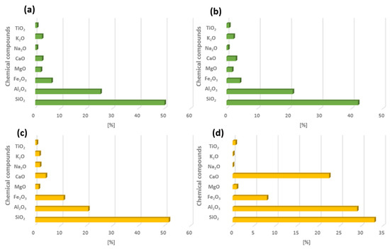 Example of chemical composition from combustion of energy resources hard coal and lignite from Polish energy plants: (a) Chemical composition of FA from coal (1), (b) chemical composition of FA from coal (2), (c) chemical composition of FA from lignite (1), (d) chemical composition of FA from lignite (2) [22].