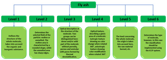 As a member of the European Union, Poland is subject to strict restrictions on the extraction and development of energy resources. In 2017, an announcement on critical raw material resources was introduced. The purpose of this document was a broad analysis of the amount of energy raw materials extracted. The main coal mining region in Poland is the Silesia Region and it is the most extensive mining area. The list of critical raw materials primarily aims to initiate the idea of a circular economy, which can be understood as the replacement of as many natural resources as possible, using industrial waste, including fly ash [34,35]. The classifications of fly ash are being upgraded at a rapid pace. The number of scientific publications devoted to fly ash is increasing each year. The authors have presented a study on fly ash classification taking into account multiple parameters ‘Identification and Petrographic Classification of Fly Ash Components Working Group, Commission III—ICCP’. In their research paper, the authors detailed the classification of fly ash into six levels: the first three define a given field in the fly ash particle, while the next three present the identification of the entire molecule Figure 5 [36].