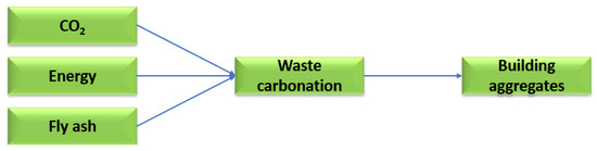 Technological solutions are being searched for to reduce the amount of calcium oxide in fly ash in favour of calcium carbonate, which is restricted both in Poland and in European Union countries. One such solution is the mineral carbonation process using carbon dioxide. The mineral carbonation process makes it possible to manage high-calcium fly ash as a raw material for the production of building materials. Carbon dioxide can be used in the mineral carbonation process to reduce calcium oxide in favour of low-energy carbonate molecules. Figure 6 shows a scheme for the saturation of waste from thermal treatment of energy raw materials with carbon dioxide [38].