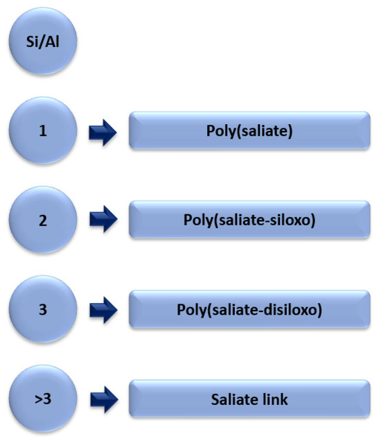 Geopolymers are inorganic aluminosilicate compounds. As previously mentioned, geopolymers were originally obtained from metakaolin. The synthetics geopolymers are obtained by chemicals activating fly ash together with an activating agent mainly NaOH [17]. Geopolymers are made up of long chains: silicon and aluminium oxide copolymers and metal cations (Na+, K+), which play a stabilising role in the structure of the geopolymer. In the synthesis of geopolymers, the most important factor that is responsible for the crystalline structure of the geopolymer is the Si/Al ratio. Figure 8 shows the Si/Al ratio and the different chains of aluminosilicate oligopolymers.