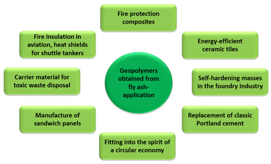 The use of fly ash in geopolymerization has many positive aspects for environmental engineering. Firstly, by using it as a substrate in the geopolymer synthesis process, the amount of landfilled fly ash from various industrial sectors is reduced. Geopolymers show properties far superior to those of classic Portland cement. Depending on the course of the geopolymerization process (the concentration of the activating agent, fly ash composition, and stabilising additives must be taken into account here), the compressive strength of geopolymers ranges from 25 to 100 MPa, while the flexural strength ranges from 5 to 25 MPa [57,58,59,60,61,62]. They are also highly resistant to acids, chlorine, and sulphur compounds. They are also resistant to weather conditions (high frost resistance) and high heat resistance of up to 800–900 °C. Figure 11 shows the possibilities of using geopolymers in industry.