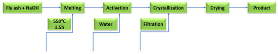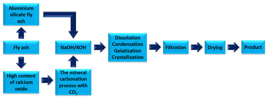 Fly ash, due to its diverse crystalline composition, exhibits many different chemical and physical properties. As a result, it is possible to reuse it in the production cycle as a raw material and/or substrate. As mentioned earlier, the idea of a circular economy is to use industrial waste as much as possible, thus minimizing the use of natural resources [15]. One of the options for using fly ash obtained from the thermal treatment of fossil fuels or unconventional fuels is the zeolite synthesis process. Zeolites are minerals found in the environment naturally, whose crystal structure is based mainly on hydrated alkali elemental aluminosilicates with a large number of micropores. Fly ash is most often used to synthesize zeolites [71]. Among the most well-known methods for the synthesising of zeolites using fly ash as the raw material is the hydrothermal method under atmospheric pressure, as shown in Figure 12. It is a multi-step physical and chemical process. The whole process takes place in a high pH environment in the liquid phase. Most often, sodium or potassium hydroxide is used. The physical parameter that affects the performance of the process is mainly temperature. The zeolitization process is carried out at 80–200 °C [72,73]. The next most widely used method for the synthesis of zeolites from fly ash waste materials is the fusion method (Figure 13). Fly ash with a high silicon oxide content is activated together with solid sodium hydroxide at a temperature around 600 °C [74,75]. Zeolites are largely used as sorbents, due to their high ability to ion exchange and sorption properties [18,19,76,77].