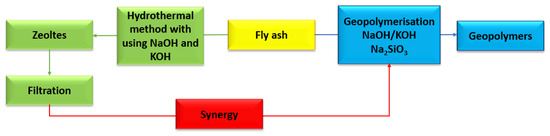 The potential of using fly ash as a substrate for the production of porous materials, in particular geopolymers and zeolites, has been extensively discussed in the scientific literature. The process of synthesising geopolymers and zeolites using fly ash fits into the idea of a closed-loop economy, which aims to maximise the use of waste materials. The authors of this study noted the importance of a hybrid process for the synthesis of geopolymers and zeolites, using the filtrate from the zeolitisation process as a substrate in the geopolymer synthesis process (Figure 16). Since chemical activation of fly ash with concentrated solutions of sodium and/or potassium hydroxide is very often used for hydrothermal synthesis of zeolites, highly alkaline aqueous by-products are formed during the process in addition to the final product. Due to the high content of hydroxide ions, it is possible to use the zeolite process waste (filtrate) as an activating substance in the synthesis of geopolymers. The hybrid process model for the synthesis of geopolymers and zeolites enables a continuous closed loop where no by-product is unused. The hybrid model of the chemical activation of fly ash, in addition to the use of by-products in the new cycle, also enables the formation of zeolite–geopolymer composites. The proposition to develop a method for the hybrid synthesis of zeolites from fly ash and then geopolymers fits into the idea of a closed-loop economy. First of all, it makes it possible to use the by-products of combustion as a new raw material and thus make use of the waste obtained at the synthesis stage. The resulting materials exhibit specific physicochemical properties, thus enabling them to be used in industry. Research on geopolymers and synthetic zeolites derived from fly ash shows that the resulting porous materials can find applications in a variety of industries, from environmental engineering to the building materials industry. Activation of fly ash with sodium or potassium hydroxide solutions provides the possibility of trapping heavy metal oxides in the matrix of geopolymers, so they do not have a negative impact on the environment.