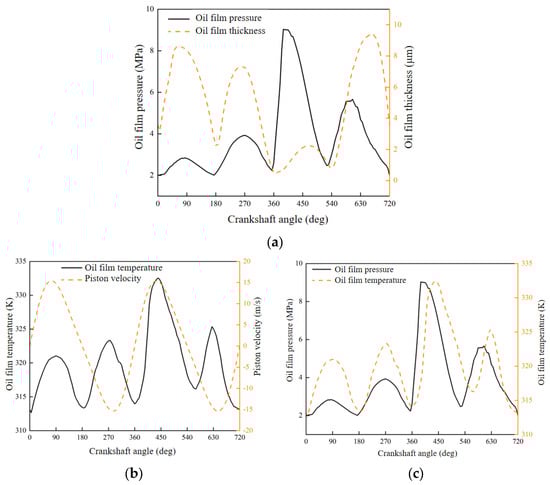 Transient thermal fluid lubrication results. (a) Oil film pressure distribution and minimum oil film thickness vary according to the angle of the crankshaft. (b) Oil film temperature and piston ring speed vary with the crankshaft angle. (c) Oil film temperature and pressure vary with the crankshaft angle.