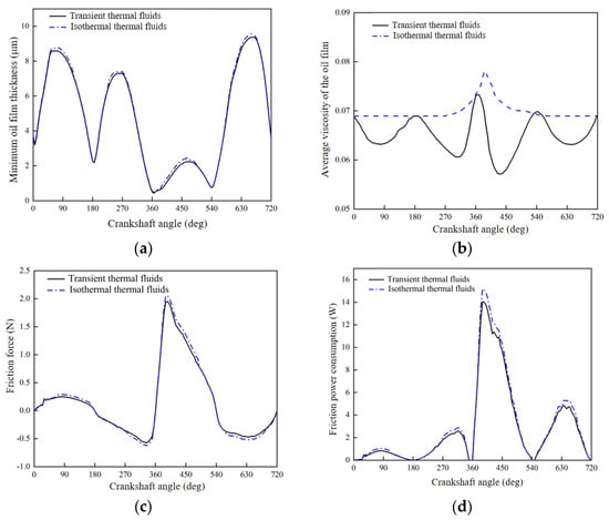 Figure 6c shows the trend of friction force with crankshaft rotation under different thermal fluid models when the lubrication system works. The trends in friction forces generated by different thermal fluid models are generally consistent; however, there are some differences between the intermediate phase of the compression stroke and the beginning phase of the power stroke, and the friction generated by using the transient hot fluid model is generally lower than that generated by using the isothermal hot fluid model. This is because of the temperature of the lube film rising in the intermediate of the stroke, which corresponds to a slight decrease in viscosity, also reduces the viscous resistance of the lube, as shown in Figure 6a,b.