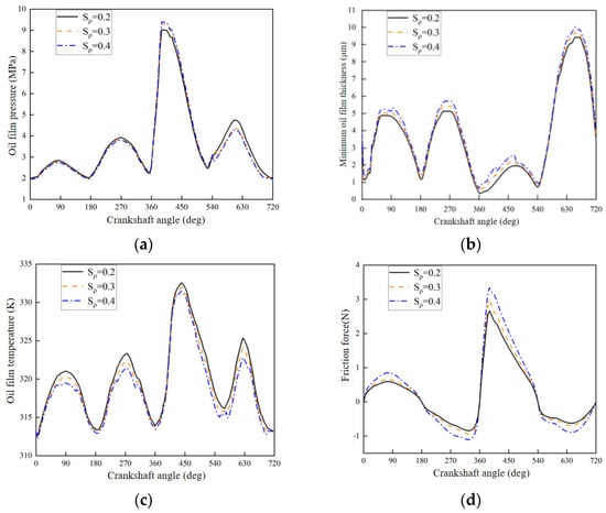 Figure 7c shows the alteration of the temperature of lube film due to different pit surface densities. Overall, the temperature change curve of the lube film is consistent. Accompanied by the ascendance in the density of the pit surface, the temperature of the lube film decreases gradually, and changes, especially in the intermediate of the stroke, are particularly noticeable. This is mainly due to the increased density of the concave surface, which increases the lube film–cylinder liner contact area, further leading to an increase in the heat dissipated toward the cylinder sleeve from the lube film. As a consequence, the heat during piston ring operation that is generated by the viscous resistance of the lube film is less than the heat emitted by the lube film. For example, Figure 7d shows the trend of friction with crankshaft angle over different pit surface densities. There is a 10–15% difference between the values at the maximum and minimum friction, and the growth of pit surface density is accompanied by an increase in friction. This is mainly because the amount of friction is mainly influenced by the combination of lubricant viscosity and lube film thickness, which decrease and increase, respectively, for different pit surface densities, resulting in increased friction. The above analysis shows that only from the angle of reducing friction and improving lubrication performance, when under certain conditions, 20% pit surface density is more beneficial to reducing friction and improving lubrication performance.
