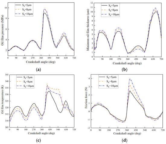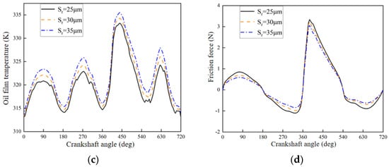 Under the transient thermal fluid model, the oil film temperature corresponding to different crater radii versus the crankshaft rotation angle is illustrated in Figure 9c. The temperature changes significantly at the halfway point of the stroke. As the radius of the weave pit increases, the oil film thickness increases gradually, and then the oil film temperature increases. In comparison, the lubricant film temperature rises in the region of the power stroke, mainly due to the lubricant film thickness decreasing gradually in this area, which produces little difference in heat and heat dissipation; thus, the oil film temperature rises gently. The trend of friction corresponding to the different pit radii with the angle of the crankshaft under the transient thermal fluid model is illustrated in Figure 9d. Overall, the friction obtained using the transient thermal fluid calculation model decreases as the pit radius increases, but the maximum friction decreases as the pit radius increases. From the angle of reducing friction and improving the lubricating characteristics, the pit radius should be chosen as far as possible from a larger one. Although the larger pit radius can reduce friction, it is not sensible to increase the pit radius; this is attributed to the fact that the lubricant film thickness increases as the pit radius increases. In turn, too thick of an oil film thickness affects lubrication adversely.