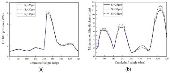 It could be observed that the distribution of lubricant film pressure is associated with the engine crankshaft angle for different pit radii under the transient thermal fluid model in Figure 9a. The distribution of lubricant film pressure generally changes in a consistent trend, and values do not change much except for the 360° crankshaft angle at different pit radii. From the results of the experiment, we can conclude that the oil film pressure is less affected by the radius of the weave pits. The minimum oil film thickness curve attributed to different pit radii under the transient thermal fluid models is also related to the crankshaft angle in Figure 9b. The minimal oil film thickness associated at the individual crankshaft angles varies significantly in different pit radii. In well-lubricated areas, an increase in the radius of the pit leads to an enlarged oil film thickness, whereas in poorly lubricated areas, the result is the opposite, which is primarily attributed to the predominance of hydrodynamic pressure effects in the well-lubricated region. In areas where lubrication is insufficient, the hydrodynamic action decreases with the piston ring speed; conversely, the increased pit radius does not facilitate the flow of the lubricating oil.