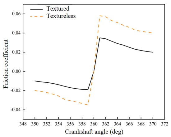Friction coefficient changes with the crankshaft angle being in the range of 350–370° can be seen in Figure 10. When the engine transitions from compression stroke to power stroke, the texture system contributes well to the reduction of the friction coefficient, mainly because the texture system enhances the hydrodynamic action, thereby increasing the oil film load-bearing capacity. It is capable of carrying more radial loads. This conclusion is also reflected in articles [,].