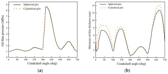 In Figure 9b, the variations in the minimal oil film thickness corresponding to different types of pits under transient thermal fluid models with the crankshaft angle is illustrated. It can be observed that the two types of pits have a quite distinct effect on the lubricant film thickness under the transient thermal fluid model. At the middle of each stroke, with sufficient lubrication, the lubricant film thickness under the cylindrical pit is greater than the one under the spherical pit. The films of cylindrical pits are 5% thicker than the lubricant film thickness associated with spherical pits; on the contrary, at the upper dead center of the cylinder sleeve where lubrication is insufficient, there is no apparent difference in the film thickness between the two types of pits. This proves that cylindrical pits have a more fluid dynamic pressure effect than spherical pits in well-lubricated areas. Nevertheless, the impact of both on oil film thickness is not significant in areas where lubrication is insufficient and operating conditions are harsh.