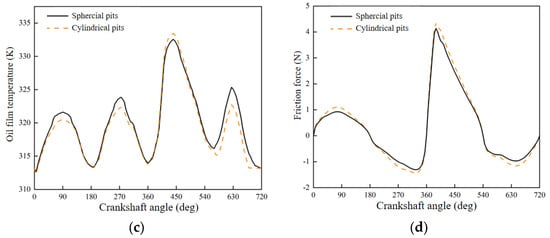 Figure 11d shows that the friction force corresponding to different crater types changes accordingly with the increasing crankshaft angle under transient thermal fluid models. The friction distribution curve for two different pits can be observed to be the same overall, while the trend of friction change varies slightly in different areas. In well-lubricated mid-stroke areas, the cylindrical pits correspond to more friction than the spherical pits; meanwhile, in areas where lubrication is insufficient, the spherical pits correspond to nearly the same friction as the cylindrical shapes. This phenomenon could be explained primarily by the reason that the oil film temperature corresponding to the spherical pits in well-lubricated areas is slightly higher than the cylindrical pits and the viscosity decreases mainly with increasing oil film temperature in the case of a moderate difference in the oil film pressure. Likewise, when the reduction in friction caused by a decrease in viscosity is more dominant than the increase in shear due to increased oil film thickness, the friction is therefore reduced. In areas where the lubrication is insufficient, there is little change in lubricant film pressure, thickness, and temperature. Thus, the friction change is not noticeable. From the perspective of reducing friction and improving lubrication characteristics only, spherical pits should be selected for the surface texture, which ensures that the friction decreases while lubricating indicators such as oil film temperature perform well.