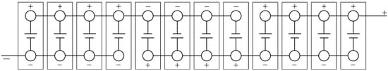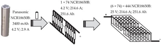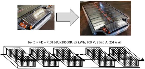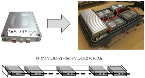 In the automotive industry, lithium-ion cells connected in an assembly of parallel–series modules are used as power sources for the electric motor of an electric vehicle when building the main battery []. Battery voltage is determined by the number of series connections. A parallel connection is used to increase the capacity of the battery []. The required voltage and capacity of the battery is achieved through various configurations of lithium-ion cells or modules. Different configurations lead to different battery performances []. For example, as shown in Figure 1, Audi in the E-tron 55/E-tron 60S electric vehicle uses a battery of 95 kW/h and a nominal voltage of 396 V. The battery consists of 36 modules of 12 cells each, giving a total of 432 elements. The lithium-ion cells in each module are connected in a 4p3s configuration. This means that four elements and four more are grouped in parallel and then connected in series.