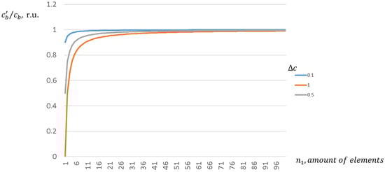 Consider the effect of these factors on the residual capacity of the battery. The dependence in the function on , where is the number of elementary cells connected in parallel in one circuit of the module for different is shown in Figure 6.