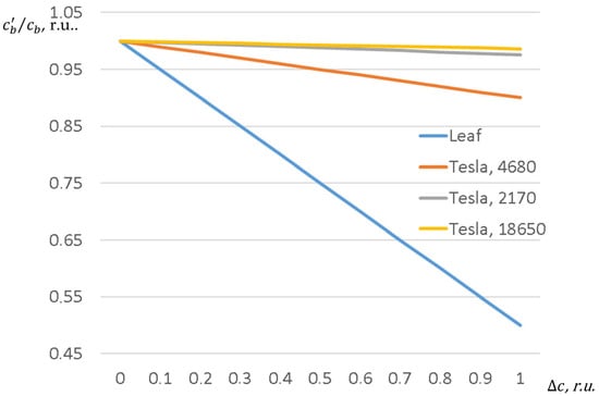 Leaf. The battery is characterized by the following design parameters: ; ; . Using Formula (10), we obtain for (10%) (95%). That is, when the degradation of two of the four cells in the module by 10% (Figure 3), there is a degradation of battery capacity by 5%.