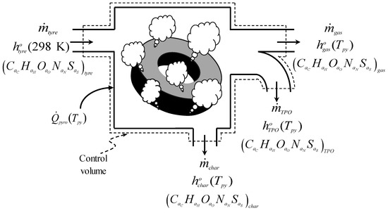 The mass flow rates of tyre material, pyrolysis gas, TPO vapour, and char are represented by , , , and , respectively, while their specific enthalpies are written as , , , and , respectively. The enthalpies are evaluated at the pyrolysis temperature () for the pyrolysis products and at 298 K for the tyre material. On the other hand, the empirical chemical formulas are used to indicate the elemental composition of the species involved in the pyrolysis reaction, where , , , , and are the number of gram atoms of C, H, O, N, and S, respectively. Then, the first law of thermodynamics is applied to the control volume in Figure 2 to determine the heat required by the tyre pyrolysis reaction at , which is calculated according to Equation (1):