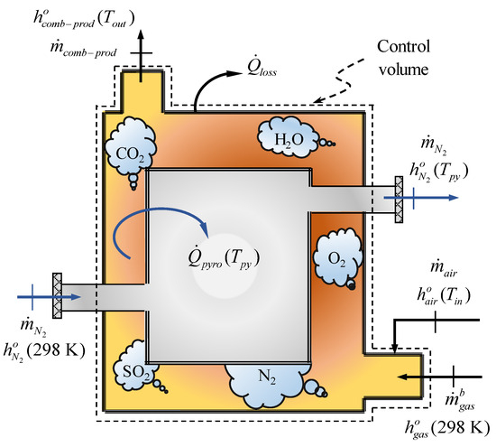 The heat obtained from the combustion of the pyrolysis gas is determined using the following control volume (Figure 3), which is individualised from Figure 1.