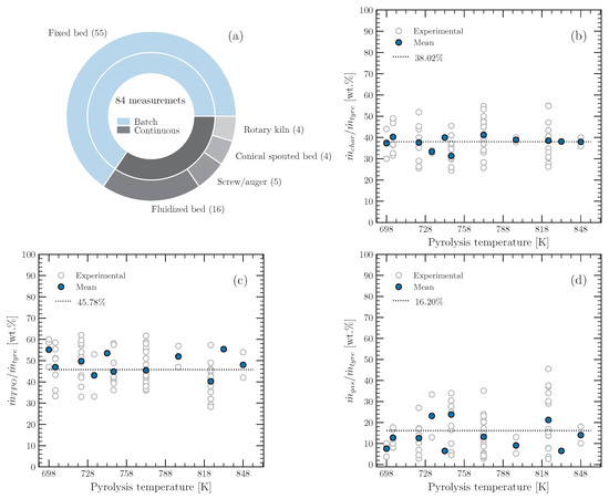 Experimental data collected for a pyrolysis temperature range between 698 to 848 K: (a) type of reactor, (b) char yield, (c) TPO yield, and (d) pyrolysis gas yield.