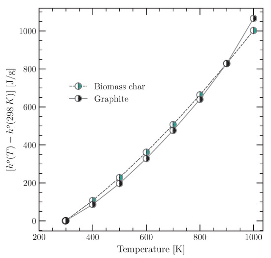 The specific heat of graphite is well defined, and experimental data are available for different temperature ranges. The data used were the NASA Glenn coefficients [54], the values of which allow the specific heat of graphite to be calculated using a fitting polynomial as a function of temperature. Then, the sensible enthalpy of the char biomass and graphite can be estimated as a function of temperature using Equation (9). The values obtained are shown in Figure 5 in order to demonstrate the reasonableness of considering the sensible enthalpy of the tyre char as the average between the sensible enthalpy of the char biomass and the sensible enthalpy of the graphite. The values obtained were fitted using a quadratic polynomial (see the Supplementary Materials), which was then used to estimate the sensible enthalpy for the tyre char according to Equation (11):