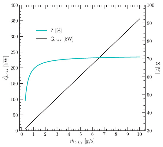 where the tyre pyrolysis process is energy self-suficient if (or 100%); otherwise, an additional fuel is needed to achieve . The subsequent combustion of the pyrolysis gas produces a mass flow of combustion products (=), which leaves the reactor at the temperature (<). On the other hand, heat losses () occur during pyrolysis due to the imperfect insulation of the reactor walls. Therefore, the energy balance of the control volume in Figure 3 is expressed according to Equation (4):