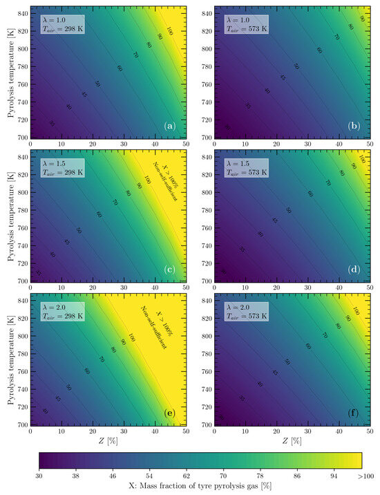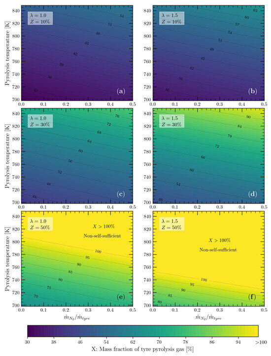 According to Figure 3, the flows through the inlet and outlet of the reactor, which correspondto the tyre and pyrolysis products being subtracted and replaced by , respectively, to leave only the flows through the inlet and outlet of the inert gas (N). On the other hand, the heat input to cover comes from the combustion of the mass flow rates of the pyrolysis gas () and air () entering the reactor, at a temperature of 298 K and , respectively. The mass flow rate corresponds to a portion of the pyrolysis gas that is produced during the thermal degradation of the tyre material, and it can be written in terms of the mass flow rate of the pyrolysis gas produced in the process as follows