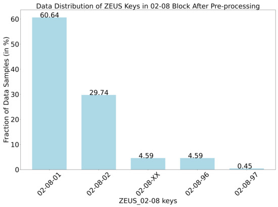 Figure 2 shows the data distribution after preprocessing. There is a slight decrease in the amount of data points belonging to the class 02-08-02, since empty reports were dropped as part of the preprocessing step. Note that the values are rounded to the second decimal. Therefore, the sum of the bars is greater than 100%. This, in turn, resulted in a slight percentage increase for the data points belonging to the classes 02-08-01, 02-08-XX, and 02-08-96, respectively.