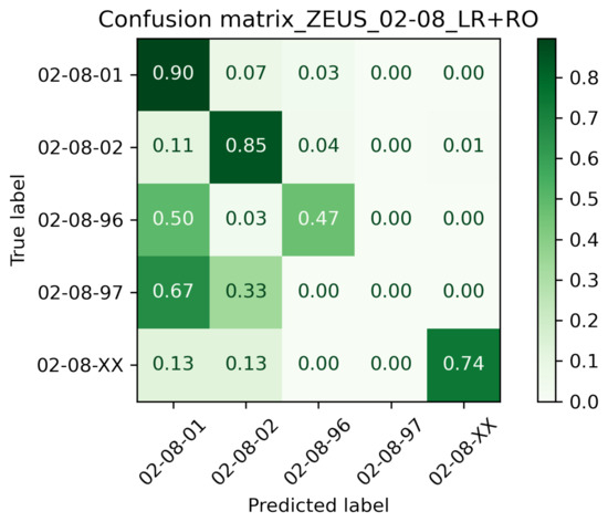 For KPI calculation, the best performing model was considered, which is LR with RO used for oversampling the minority class data. Somewhat surprisingly, random oversampling mostly leads to better scores than the more elaborate SMOTE for both classification models. The detailed classification results of the LR + RO model, including performances for each class, are given in Table 4. Figure 3 depicts the confusion matrix for the LR + RO classifier. It shows that nearly 90% of the data samples belonging to the ZEUS class 02-08-01 and 85% of the data samples belonging to the ZEUS class 02-08-02 have been classified correctly. In contrast to this, scores are lower for the remaining classes, possibly since they are minority classes and constitute only 10% of the total sample, which means that less training data was available. We may note that, in general, except for ZEUS class 02-08-97, the scores are considerably higher than the expected values that would result from a random classification (i.e., each class being predicted either with uniform random probability or with probabilities proportional to the class distribution).