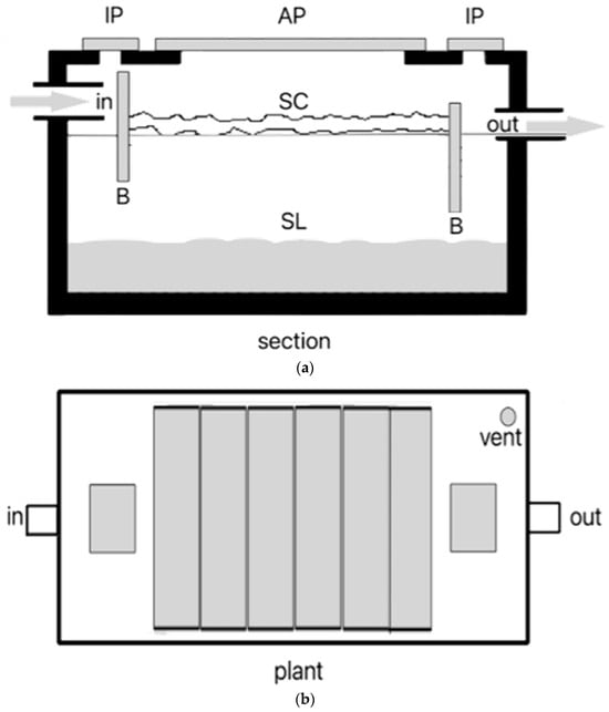 (a) Typical cross-section elevation adapted from [] and (b) typical plan view of septic tank. Legend: IP = inspection port; AP = access port; SC = scum; B = baffles; SL = sludge.