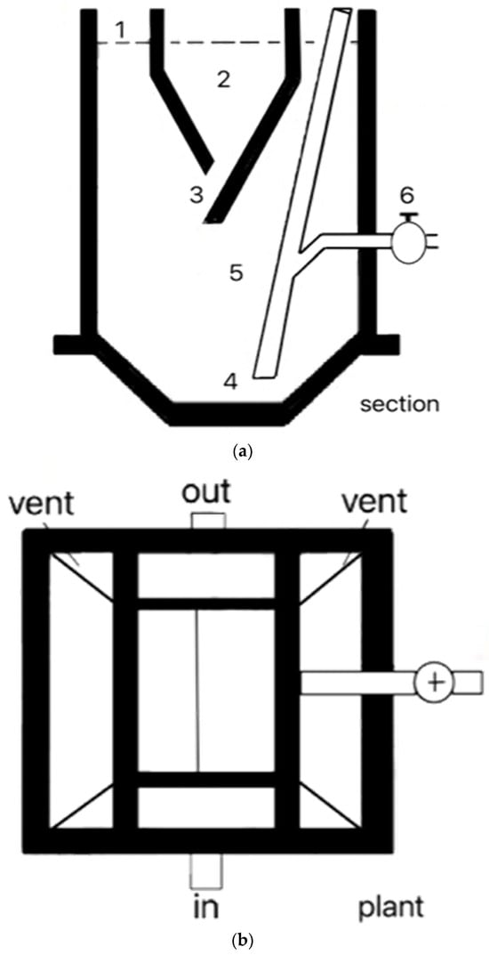 (a) Typical cross-section adapted from [] and (b) typical plan of an Imhoff tank. Legend: 1. Scum chamber; 2. Settling chamber; 3. Slot overhang; 4. Sludge digestion chamber; 5. Neutral zone; 6. Sludge removal valve.