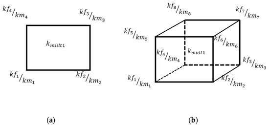 For numerical implementation, the open-source codes MATLAB Reservoir Simulation Toolbox (MRST) [35] and OpenGeosys [23] were coupled in this study. The thermo–hydro simulation was conducted using the MRST, and the permeability multipliers are updated at each nonlinear iteration between the two models. After each iteration, the pressure and temperature are sent to the phase-field fracture code implemented in OpenGeosys, and the permeability multipliers are received. Because the phase-field equation is discretized using the finite element method, the phase-field variables are computed at each node. For this study, an eight-node linear element was employed (Figure 2), and the permeability multiplier used for the flow code was computed using the following formula:
