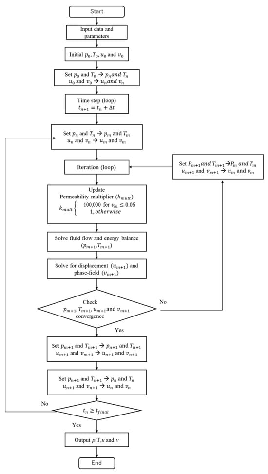 The primary variables of the thermo-hydromechanical model developed in this study were pressure (), temperature (), displacement (), and the phase-field variable (). The mass balance equation, energy balance equation, and phase-field equation must be solved using an adequate coupling technique.