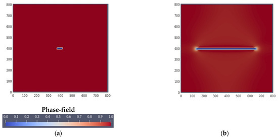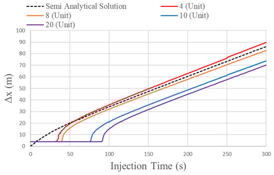 Figure 4 shows fracture half-lengths simulated by the MRST–phase-field model. To investigate the mesh sensitivity of the numerical model, the simulation was run for four different mesh sizes (4, 8, 10, and 20 units) being compared with the semi-analytical solution by [43]. The simulation results showed that it took a certain time for the fracture to start growing in the numerical simulation. Since the finite length of the initial fracture was assumed in the numerical model, it took some time to build up the pore pressure above the fracture propagation pressure in the domain. As shown in the figure, the deviation from the semi-analytical solution became smaller when a smaller mesh size was used. Overall, the numerical simulation results approached the semi-analytical solution with finer mesh sizes.