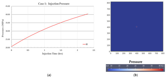 In this case, no thermal propagation or mechanical effects were considered. Figure 7 illustrates the bottom hole pressures of the injection well and the pressure distribution in the reservoir. As shown in Figure 7a, the injection pressure gradually increased as the water injection proceeded and reached a pressure of 40 MPa, which was above the minimum horizontal stress of 20 MPa. However, no fracture nucleated, because the mechanical effects were ignored in this case. The excess injection pressure dissipated radially in the near-wellbore vicinity, as illustrated in Figure 7b.